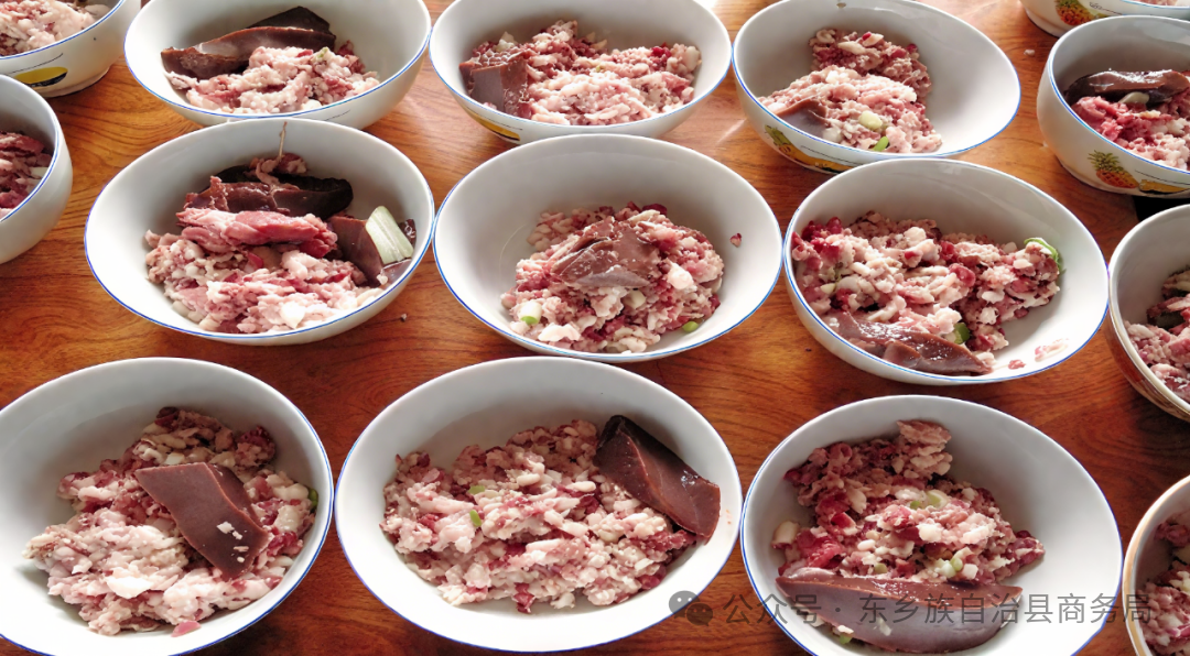 首先把羊的心、肝、肺,羊脖子等精肉少许洗净剁碎,拌上切好的葱花、调料、香油、味精,撒上少许面粉,搅匀,按吃平伙的人数分成若干份装在小碗里备用。等大锅内煮羊肉的水开锅后,在大锅上架起蒸笼,把装好的小碗整齐摆放在蒸笼中蒸熟,东乡人称它为“发子”。热气腾腾香味扑鼻的发子浇上沸腾的羊肉汤,撒上碧绿的青蒜苗,就着黄嫩喷香的油香,悠闲地刮着细瓷盖碗茶。或是把新鲜的羊肝爆炒后端上来品尝,鲜嫩醇香,人们常说“先来的克巴布(东乡语指羊肝)比后来的肉香”,从而拉开了吃平伙的序幕。