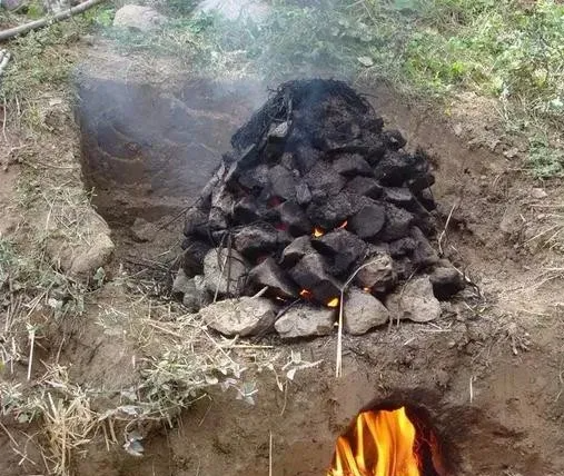 用大小不一的土块从下到上垒成圆锥形“土塔”,确保留有缝隙以通风助燃。土块烧红后,温度可达焖熟食材所需。