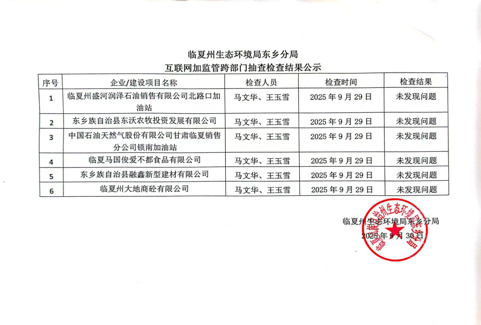 临夏州生态环境局东乡分局互联网加监管跨部门抽查检查结果公示