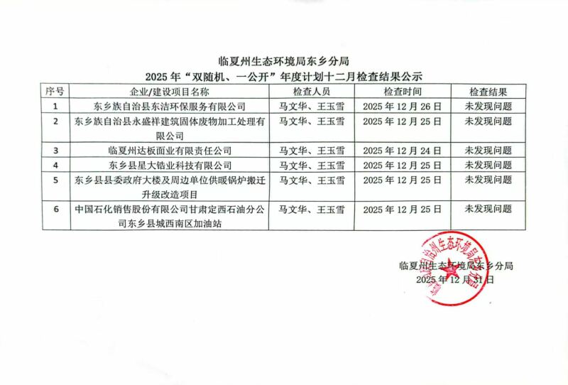 临夏州生态环境局东乡分局2025年“双随机、一公开”年度计划十二月检查结果公示
