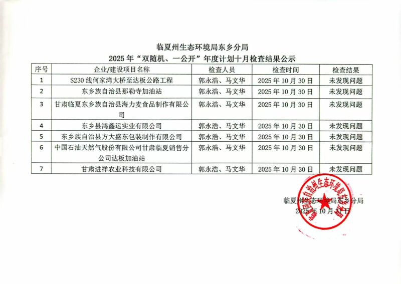 临夏州生态环境局东乡分局2025年“双随机、一公开”年度计划十月检查结果公示