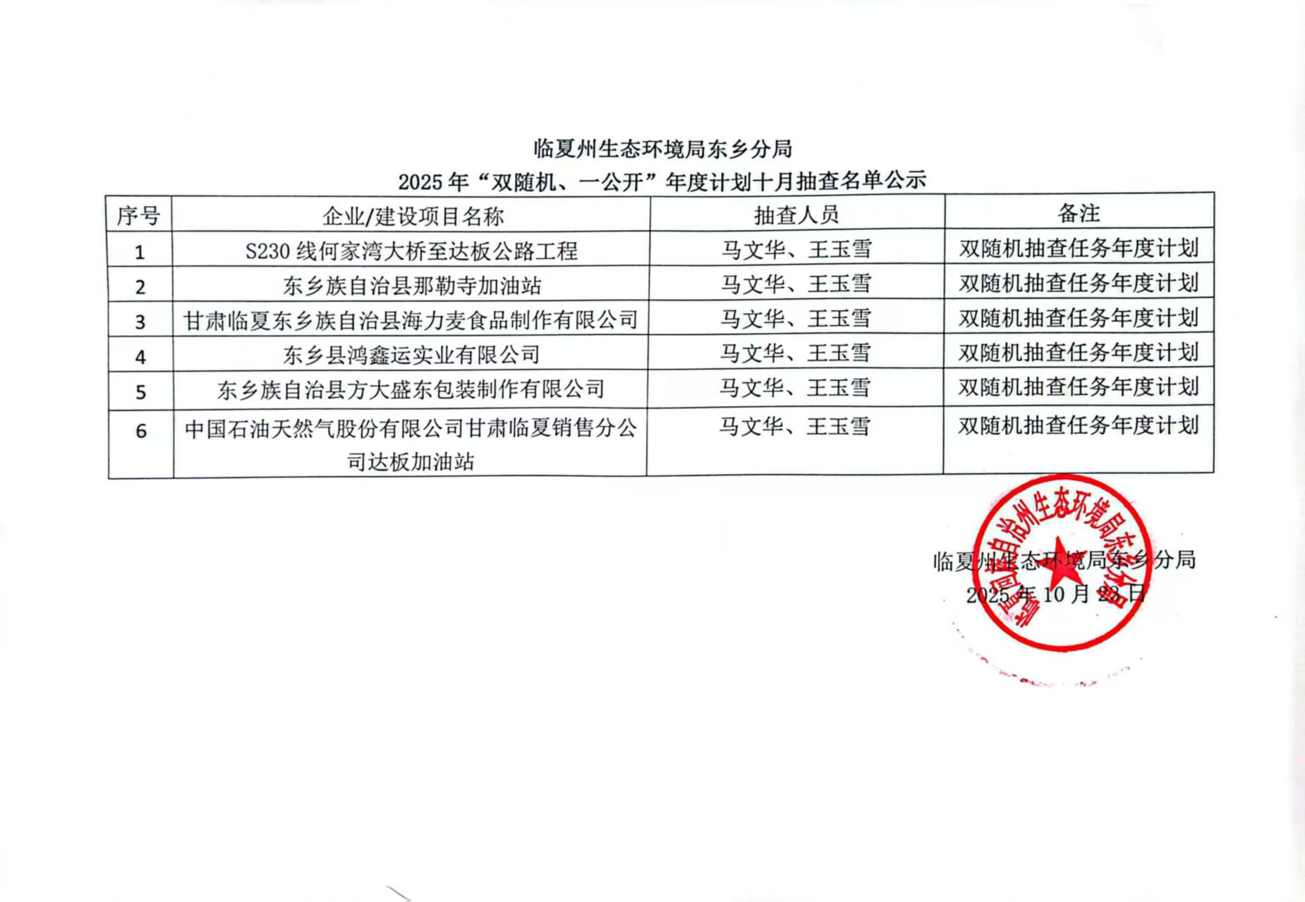 临夏州生态环境局东乡分局2025年“双随机、一公开”年度计划十月抽查名单公示
