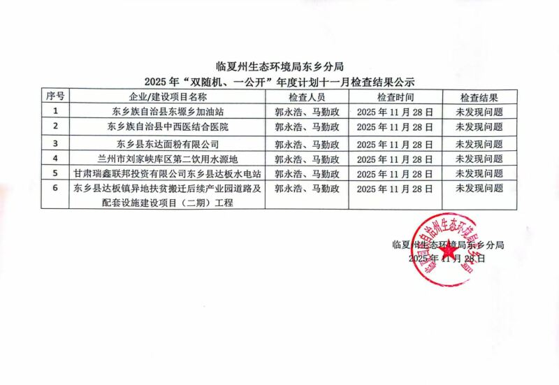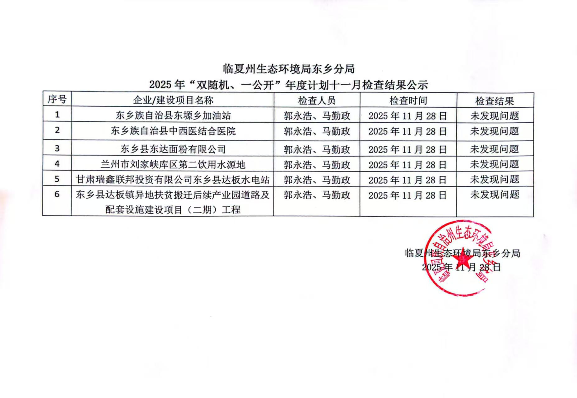 临夏州生态环境局东乡分局2025年“双随机、一公开”年度计划十一月检查结果公示