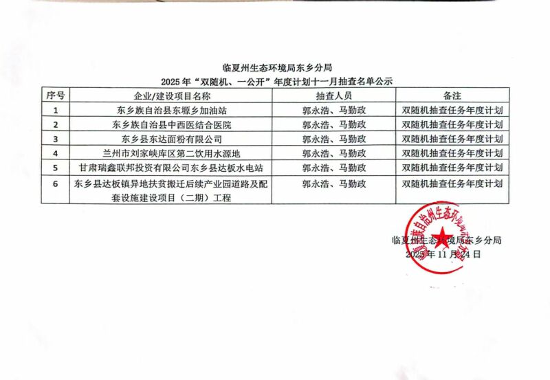 临夏州生态环境局东乡分局2025年“双随机、一公开”年度计划十一月抽查名单公示