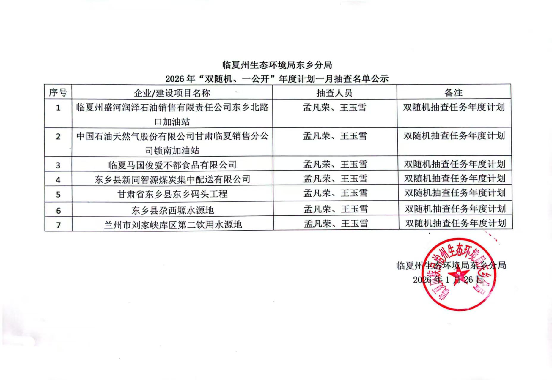 临夏州生态环境局东乡分局2026年“双随机、一公开”年度计划一月抽查名单公示