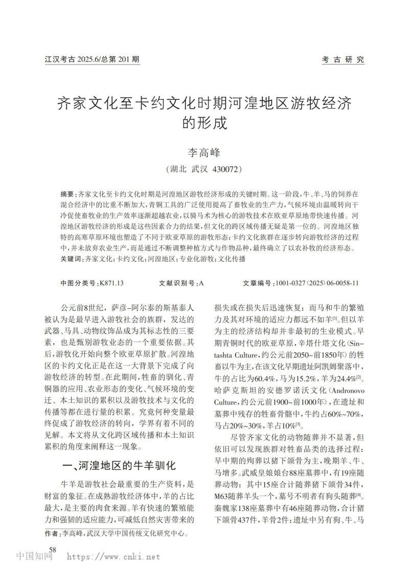 谈齐家文化至卡约文化时期河湟地区游牧经济的形成