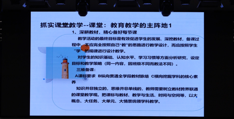 邢岩梅围绕教师专业成长,从课堂教学优化、教师培训赋能、课题教研突破三方面分享,结合实践与理论为教师指明成长路径,其中“落实课堂教学”是核心要点,反响最热烈。