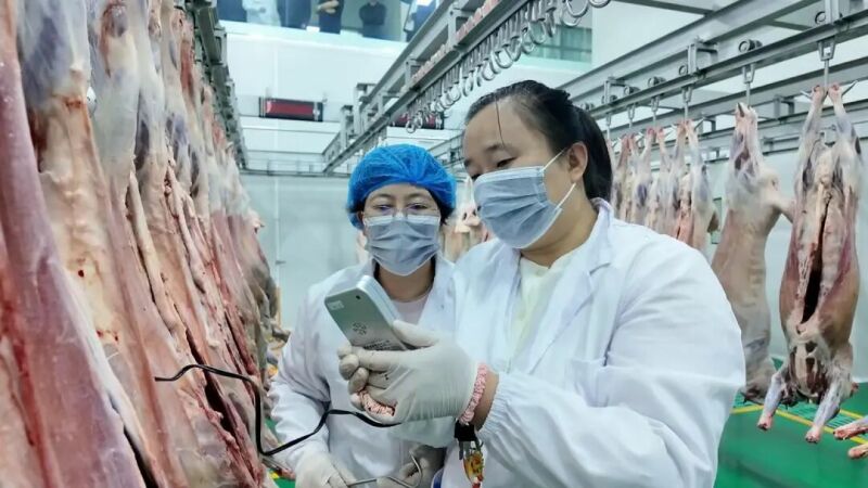 随后走进鑫聚缘贡羊食品有限公司,此前东乡县刚在北京发布东乡贡羊发布会,产品备受关注。镜头记录该公司生产车间环境、设备清洁,以及肉质检测过程,同步呈现肉质检测合格标准书。