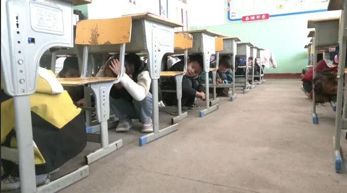 锁南民族小学的防震应急疏散演练则全程紧扣“实战化”标准。演练前,工作人员与学校教师共同优化疏散方案,明确各楼层引导员职责、疏散路线及安全集结点,并通过课堂宣讲提前向学生普及“伏地、遮挡、手抓牢”的应急防护动作要领。随着第一声模拟地震警报划破校园,全校师生立即进入应急状态:教室内,学生迅速双手抱头、蹲伏在课桌下方,利用课桌遮挡保护头部;走廊里,教师带领学生保持“低姿弯腰、双手护头”的姿势,沿着预定路线快速向操场安全区域疏散。整个过程中,各班级队列整齐、衔接有序,无拥挤、推搡现象,全体师生全部安全抵达集结点,随后各班班主任迅速清点人数并向总指挥汇报。地震演练中学生们抱头蹲伏在课桌下。东乡县融媒体中心记者 周学虎 摄此次活动不仅让锁南镇师生及群众系统掌握了防震减灾知识,更通过实战演练检验了应急方案的可行性,为全县构建“学校-社区-家庭”联动的防震减灾体系奠定了坚实基础。