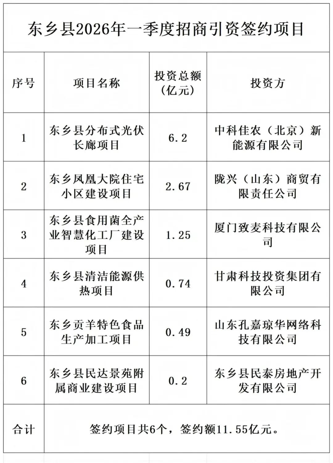 近年来,东乡县认真贯彻落实省上“引大引强引头部行动”和州上“千亿招商”行动,锚定打造“五个地”目标定位,把招商引资作为放大资源优势的重要牵引、培育产业集群的有力抓手,围绕“四大经济带”布局,通过上门招商、联合招商、以商招商、节会招商等方式,积极谋划和引进了一批符合国家产业支持导向、科技含量高、市场前景好、带动能力强的优质项目。此次签约的6个项目总投资约11.55亿元,涵盖了清洁能源、现代农业、食品加工、房地产开发等多个领域,规模体量大、质量结构优、辐射带动强,高度契合东乡资源禀赋、深度融合产业发展布局,必将为我县注入新的发展动能,进一步优化产业结构、提升产业链水平、增强经济发展后劲、促进群众就业增收。
