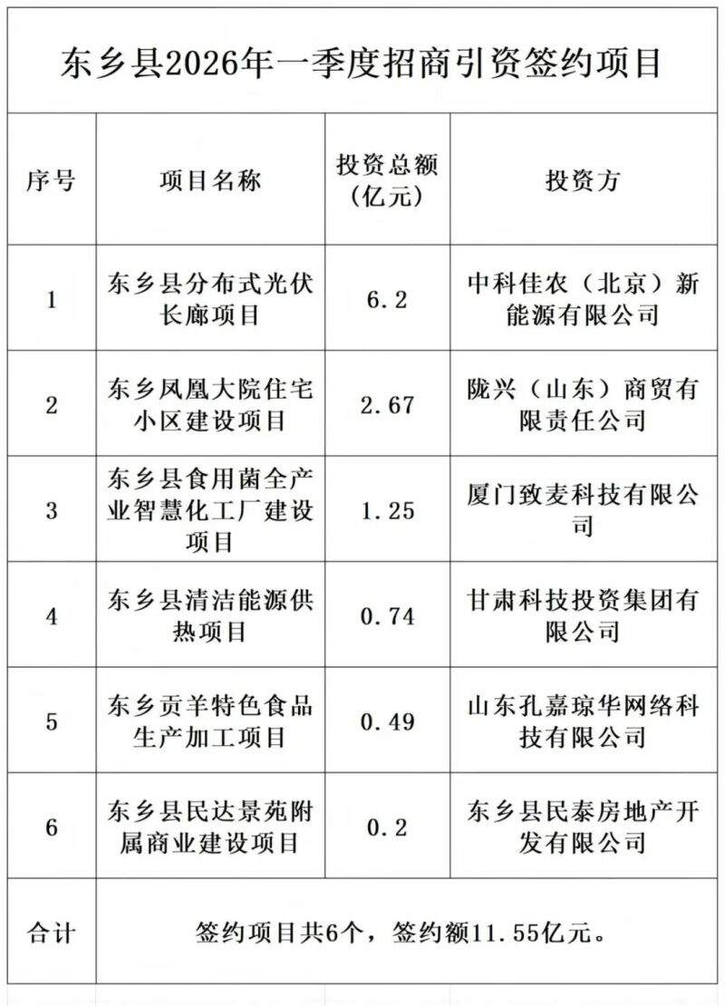 东乡县举行2026年一季度招商引资项目集中签约仪式