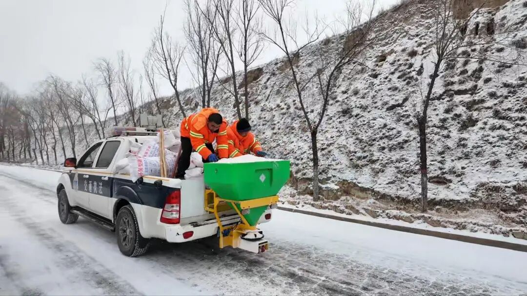 交通部门在主干道等泼洒融雪盐。东乡县融媒体中心记者 喇海涛 摄
