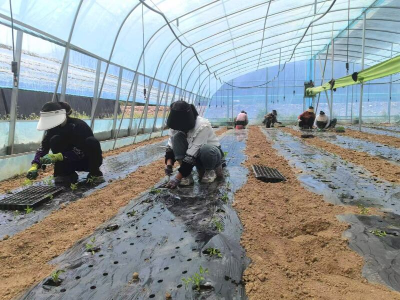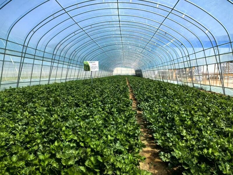 在育苗大棚内,西芹幼苗整齐排列,叶片舒展如碧玉,据介绍,这些幼苗采用水肥一体化培育技术,成活率可达90%以上。与育苗区相邻的生产大棚里,几名农户正在进行西红柿苗定植作业,一派忙碌。