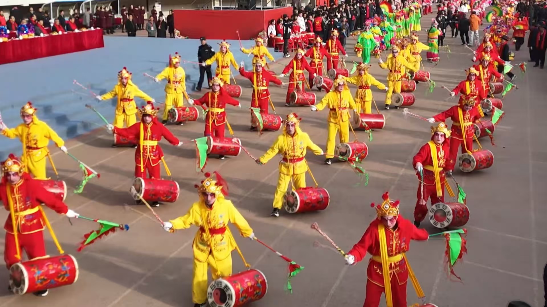 本次东乡县社火展演队由河滩镇5个村的100余名群众组成,老艺人流传非遗技艺,返乡青年注入新鲜活力,农闲排练、以老带新,将东乡人的热情与豪迈融入每一个表演细节。展演现场,仪仗队旗幡迎风招展,财宝神送福纳祥,舞狮腾跃灵动,经典社火角色鲜活生动;太平鼓表演更是气势十足,“鹞子翻身”“牡丹开花”等招式轮番上演,鼓点铿锵多变,敲出东乡儿女的豪情,也打出太平盛世的美好祈愿,精彩表演赢得现场观众阵阵喝彩。
