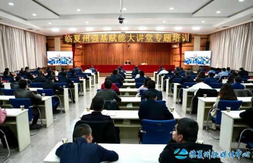 州领导万学科、杨福波、马斌、张自贤、郭海泉、李鹏、马显锋在主课堂参加,李勇在积石山县分课堂参加,州委常委、州委组织部部长黄海龙主持。